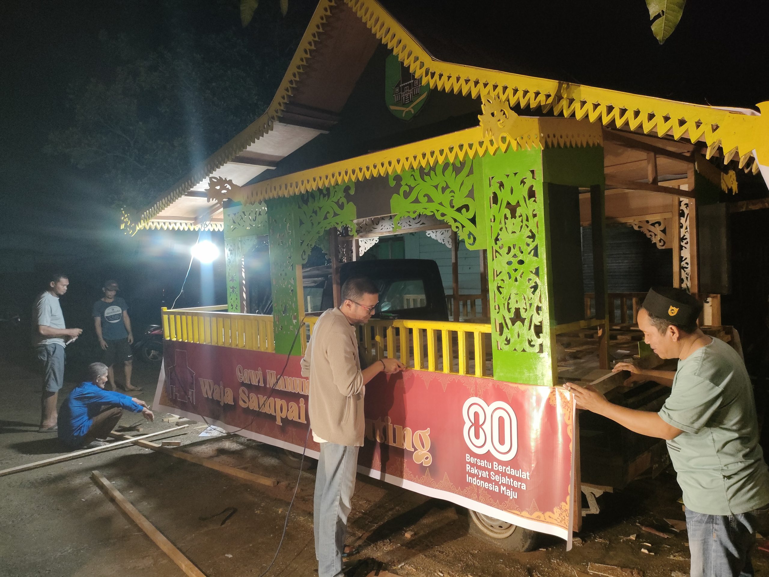 “Mobil hias ini kami rancang menyerupai rumah adat Banjar lengkap dengan ukiran dan ciri khasnya. Semua kami kerjakan dengan penuh semangat gotong royong agar hasilnya benar-benar maksimal,” jelas Hersonsyah.