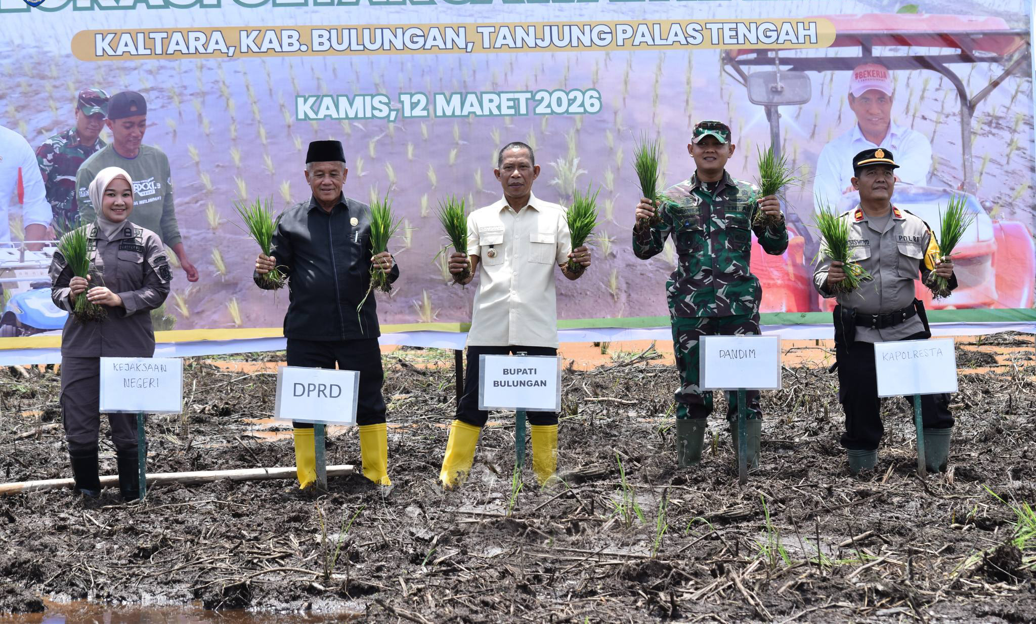 BULUNGAN, MK – Bupati Bulungan, Syarwani, S.Pd, M.Si bersama jajaran Pemkab, Forkopimda dan masyarakat petani mengikuti Gerakan Tanam Serentak di lokasi Cetak Sawah Rakyat (CSR) di wilayah Desa Salimbatu, Kecamatan Tanjung Palas Tengah pada Kamis (12/3).