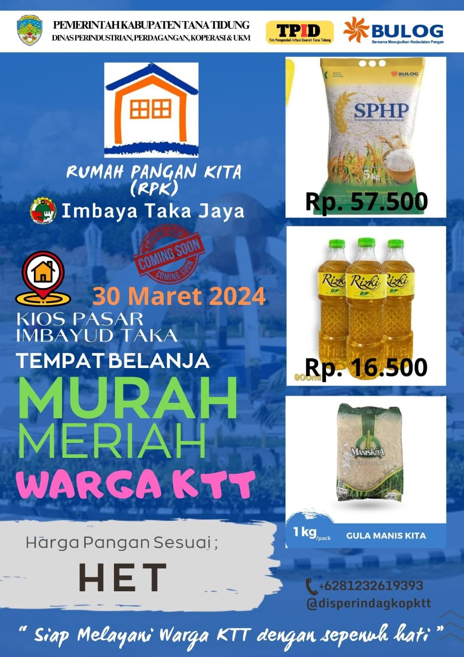 Maka Pemerintah Kabupaten Tana Tidung melalui dinas Perindagkop & UKM menginisiasi serta melakukan kerjasama dengan BULOG Cabang Bulungan melalui pembentukan RPK ( Rumah Pangan Kita ) yang nantinya akan menjual beberapa produk pangan seperti beras, minyak goreng, gula dll dengan harga terjangkau dan sesuai HET yang telah ditetapkan oleh Pemerintah.
