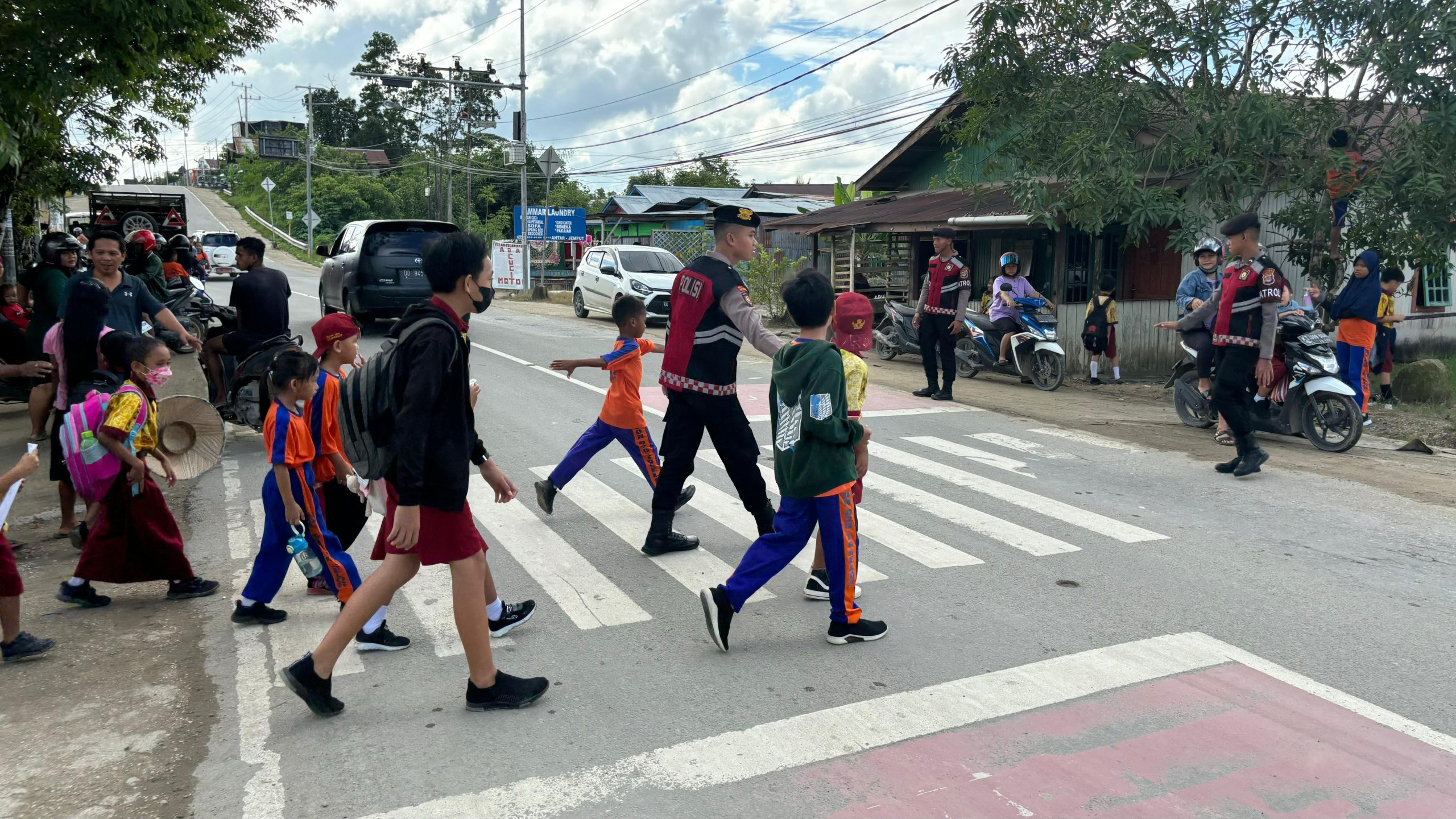 Anggota Ditsamapta Polda Kaltara melaksanakan pengaturan dengan membantu menyeberangkan anak sekolah yang berseberangan dengan jalan ramai guna mencegah terjadinya kecelakaan lalu lintas karena terkadang anak-anak sekolah menyeberang sembarangan dan bergerombol tanpa memperhatikan arus lalu lintas.