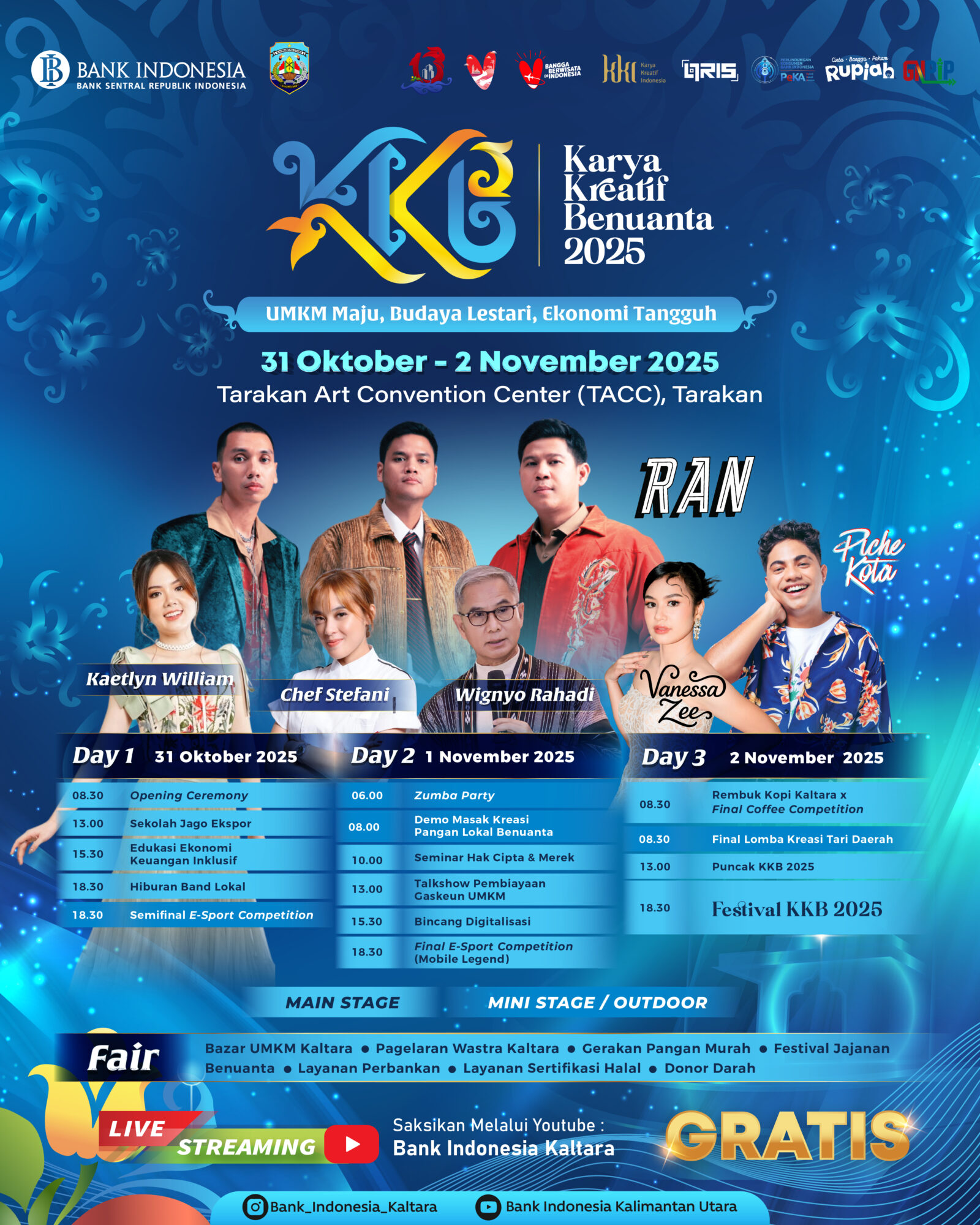 TARAKAN – Bertajuk “UMKM Maju, Budaya Lestari, Ekonomi Tangguh”, Bank Indonesia (BI) Provinsi Kalimantan Utara kembali menggelar ajang Karya Kreatif Benuanta (KKB) 2025. Kegiatan ini akan berlangsung selama tiga hari, mulai 31 Oktober hingga 2 November 2025, di Tarakan Art and Convention Center (TACC), Kecamatan Tarakan Timur.