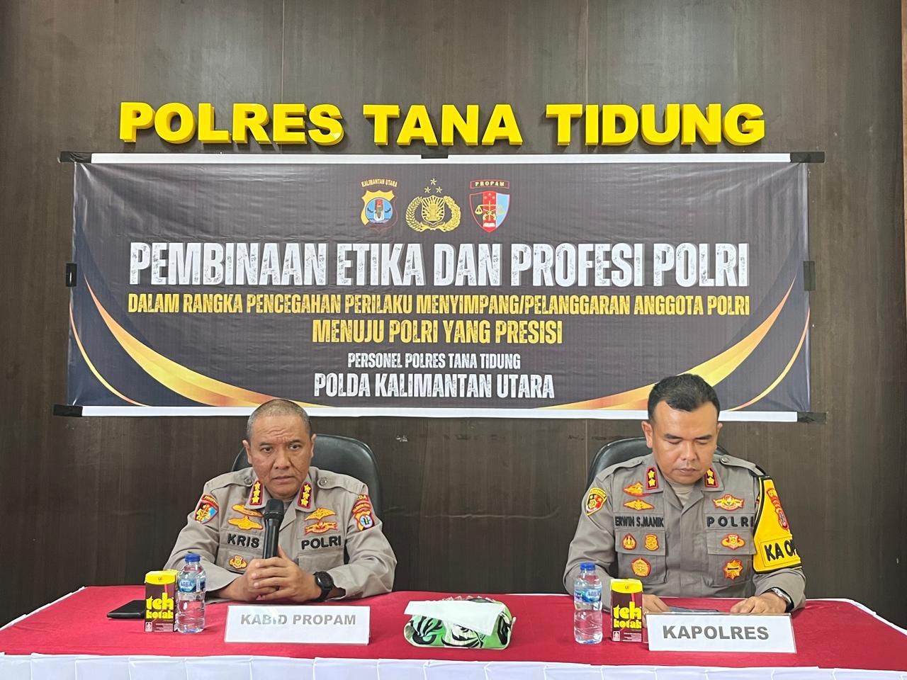 Tana Tidung, MK – Kabidpropam Polda Kaltara Kombes Pol. Kombes Pol Krishadi Permadi, S.I.K., M.H. melaksanakan pembinaan etika profesi Polri dan sosialisasi larangan bergaya hidup hedonisme kepada Personel Polres Tana Tidung, Kamis (15/08/2024)