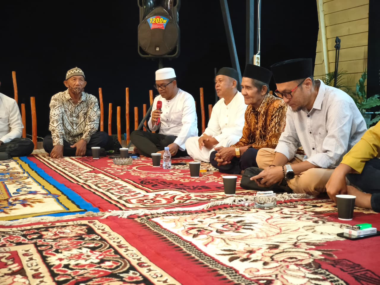 Tampak Ketua KKB Hersonsyah duduk di tengah lingkaran jamaah, mengenakan baju koko putih dan peci hitam, memimpin doa bersama dengan suara tenang dan penuh penghayatan. Puluhan warga Banjar, mulai dari pegawai, pedagang, hingga anak muda turut hadir, memenuhi ruangan yang disulap menjadi tempat pengajian sementara. Aroma kopi yang masih tersisa di meja menambah kehangatan malam itu.