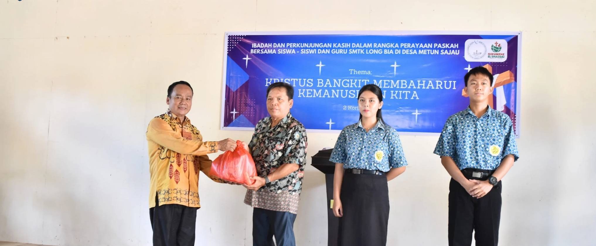 Bulungan, MK – Wakil Bupati (Wabup), Kilat, A.Md bersama Persekutuan Doa Oikumene El Shaddai ASN Pemkab Bulungan melaksanakan kunjungan kasih dan ibadah perayaan Paskah di Sekolah Menengah Teologi Kristen (SMTK) Long Bia di Desa Sajau, Kecamatan Tanjung Palas Timur pada Jumat (24/4).