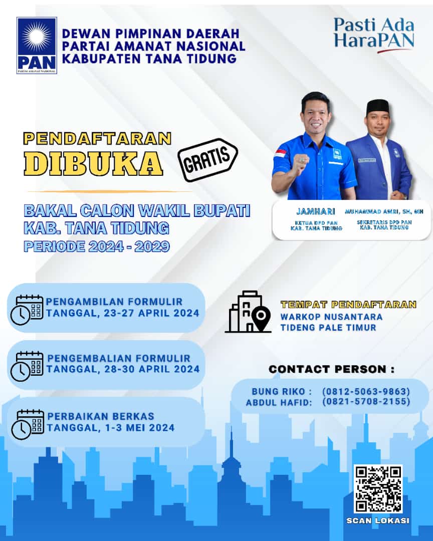 Selain itu, perlu diketahui bahwa pendaftaran penjaringan Bakal Calon Wakil Bupati Tana Tidung di DPD PAN tidak dipungut biaya alias GRATIS.
