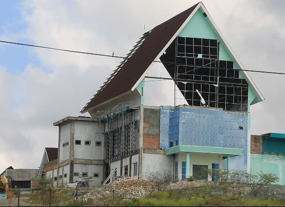 Rumah sakit itu dibangun beberapa tahun lalu tetapi kondisinya kini mangkrak tak beraturan sebab dana sekitar Rp 60 miliar amblas namun bangunan tidak kelar.